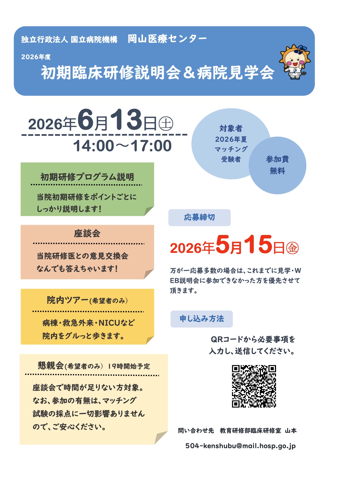 岡山医療センターについて詳しく知って頂くために「初期臨床研修説明会&病院見学会」を現地開催いたします!